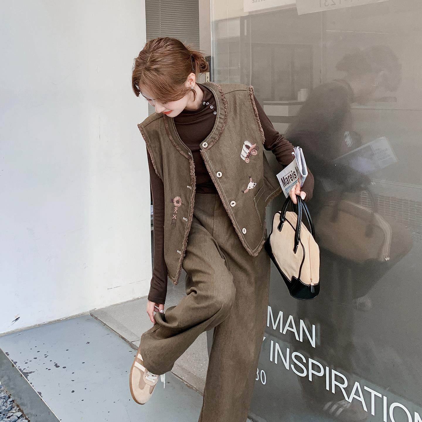 韩系流苏刺绣马甲套装女秋季2025新款气质显瘦打底衫阔腿裤三件套