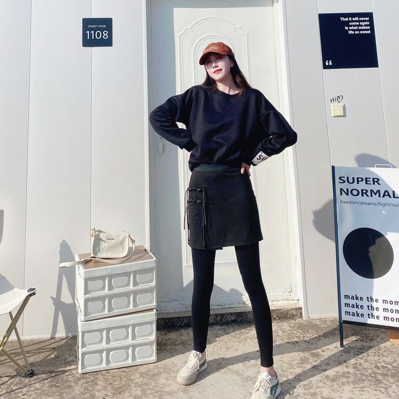 欧美流苏打底裙裤秋冬女包臀裙裤大码仿皮假两件胖妹妹可穿打底裤