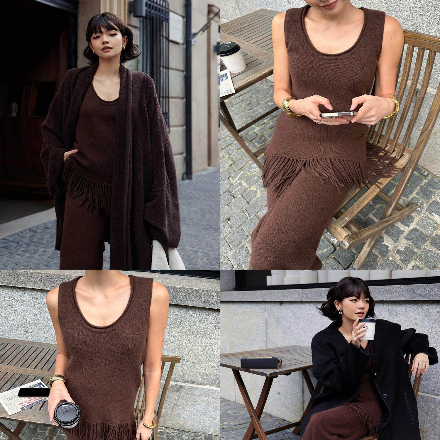 Bettychow 打底神器!Betty私服羊绒流苏棕色背心直筒阔腿裤套装