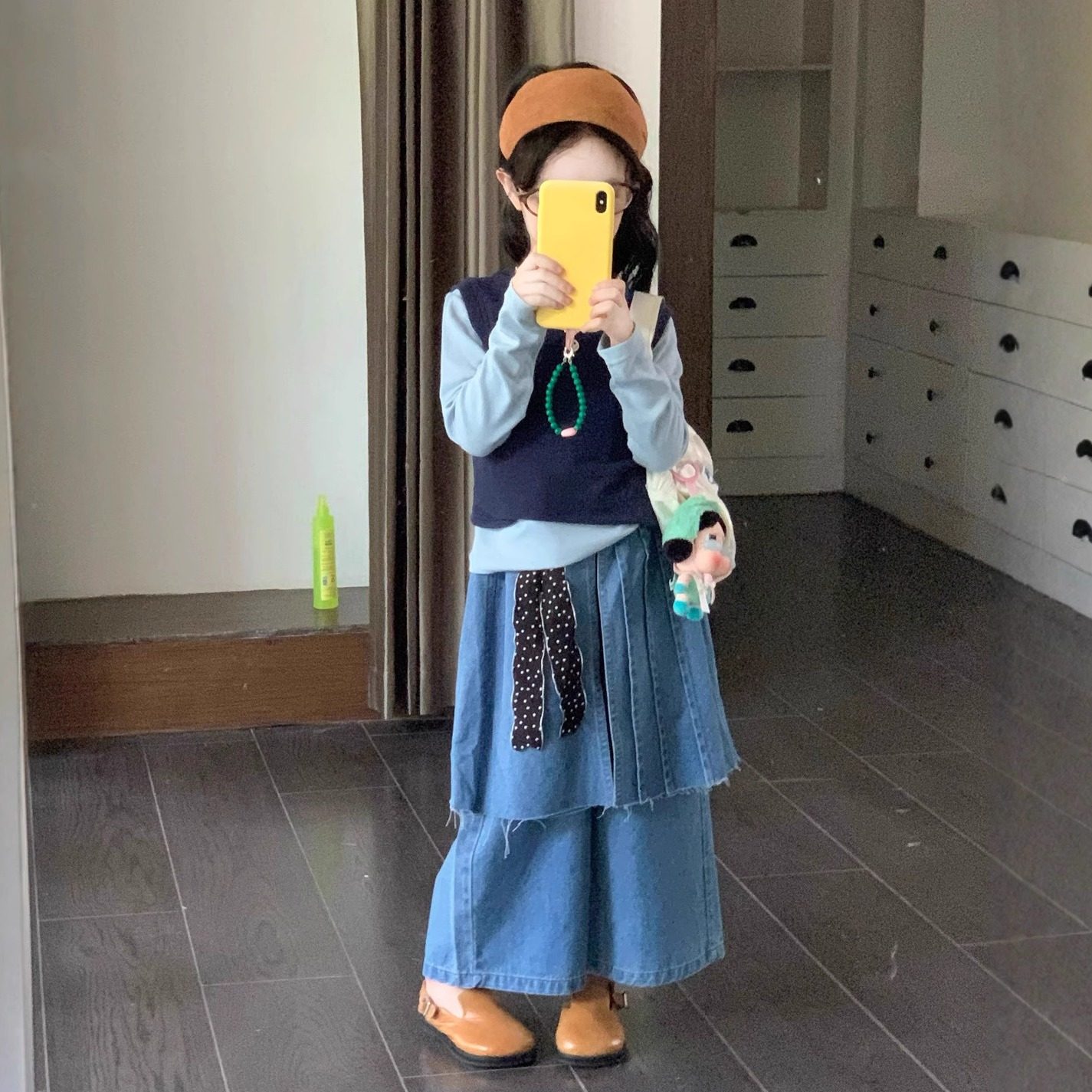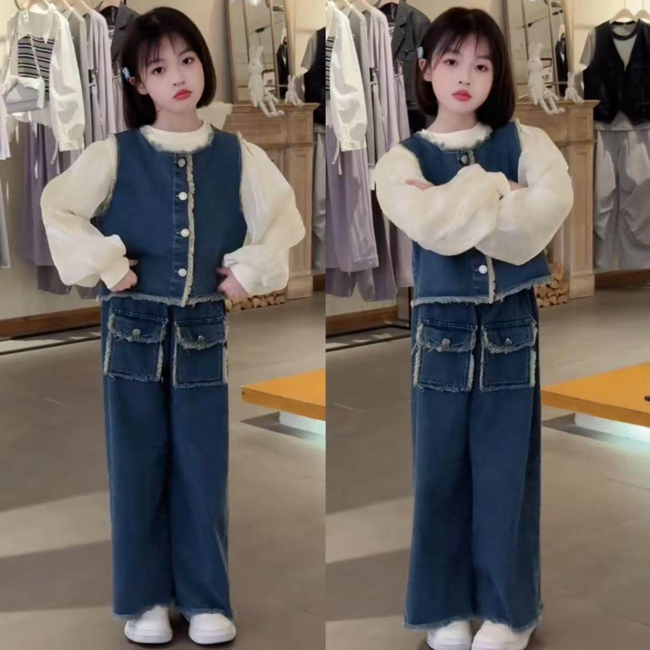 时髦女童阔腿牛仔长裤带流苏屁帘+撞色打底衫背心套装上衣25秋