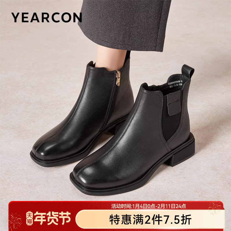 意尔康女鞋2025冬季真皮法式短靴粗跟气质显瘦配裙子单靴及踝靴女