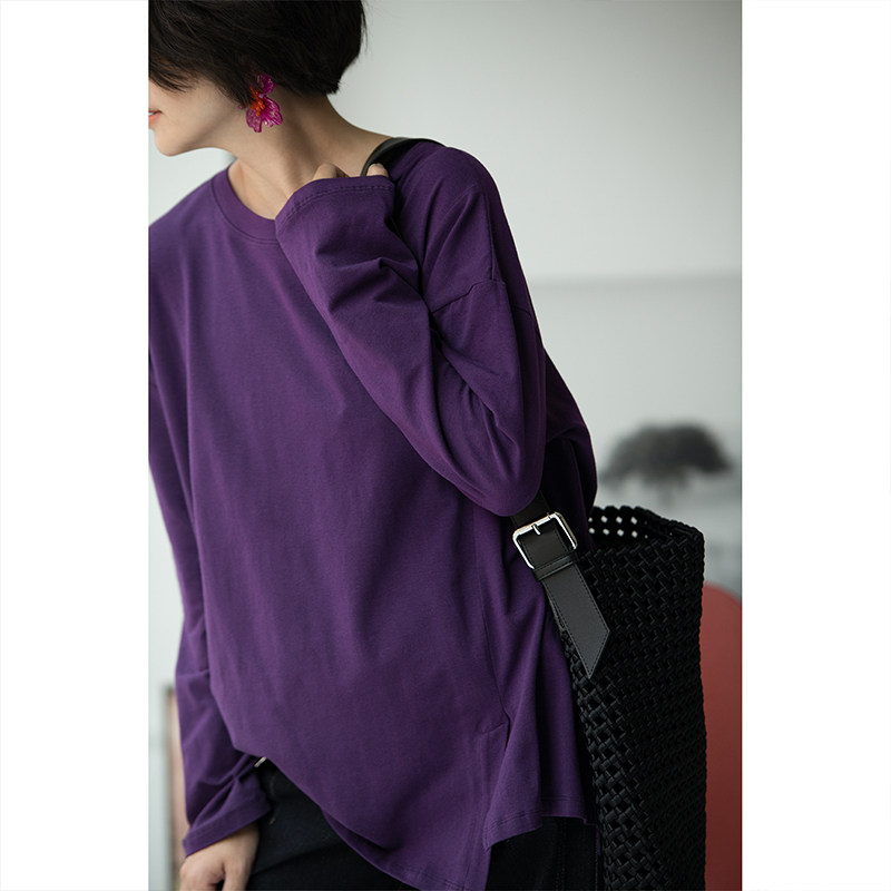 T20391 文艺简约圆领长袖宽松不对称下摆打底纯色T恤女秋米兰宣言