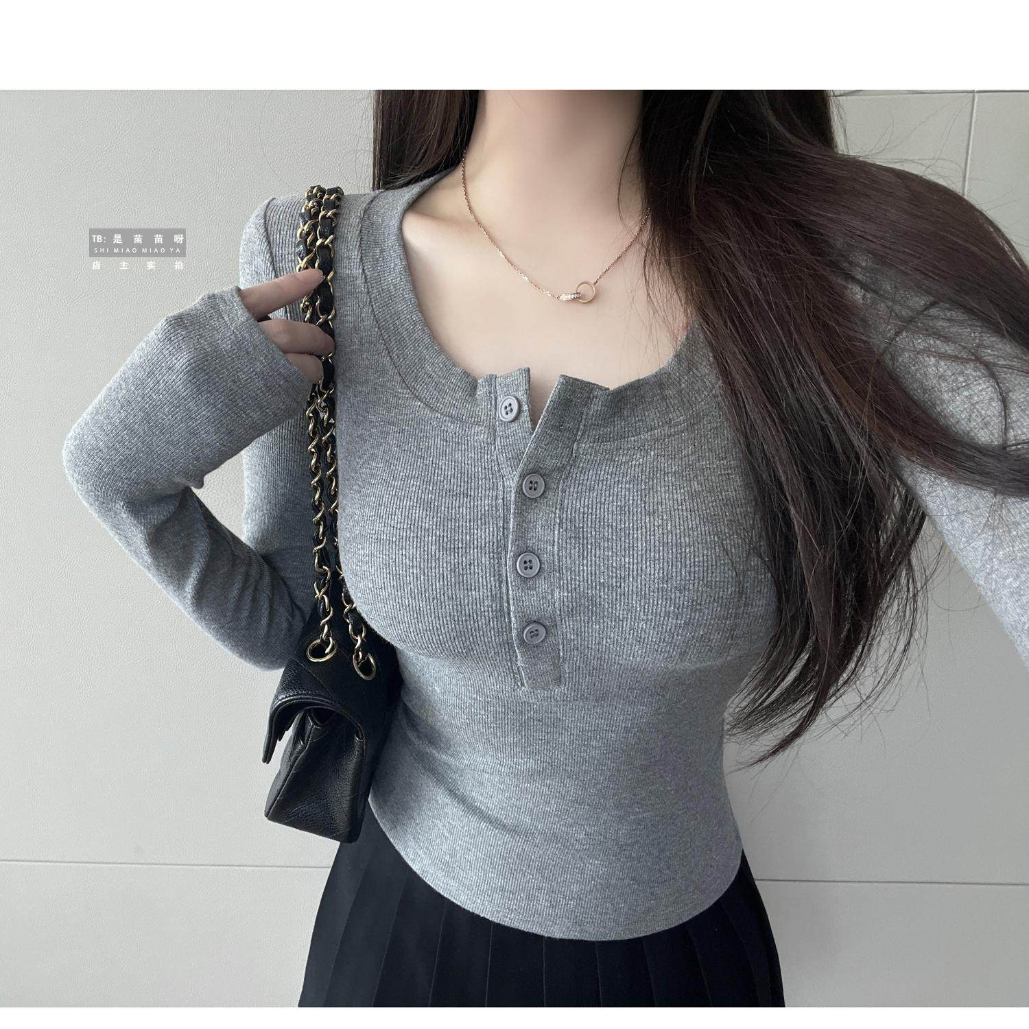 橘子树在哪儿纯欲风排扣长袖t恤女秋季款显瘦打底衫百搭纯色上衣