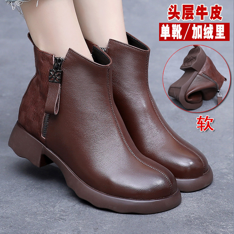 39235牛皮短靴女春秋单靴新款真皮软底妈妈鞋中老年复古短靴
