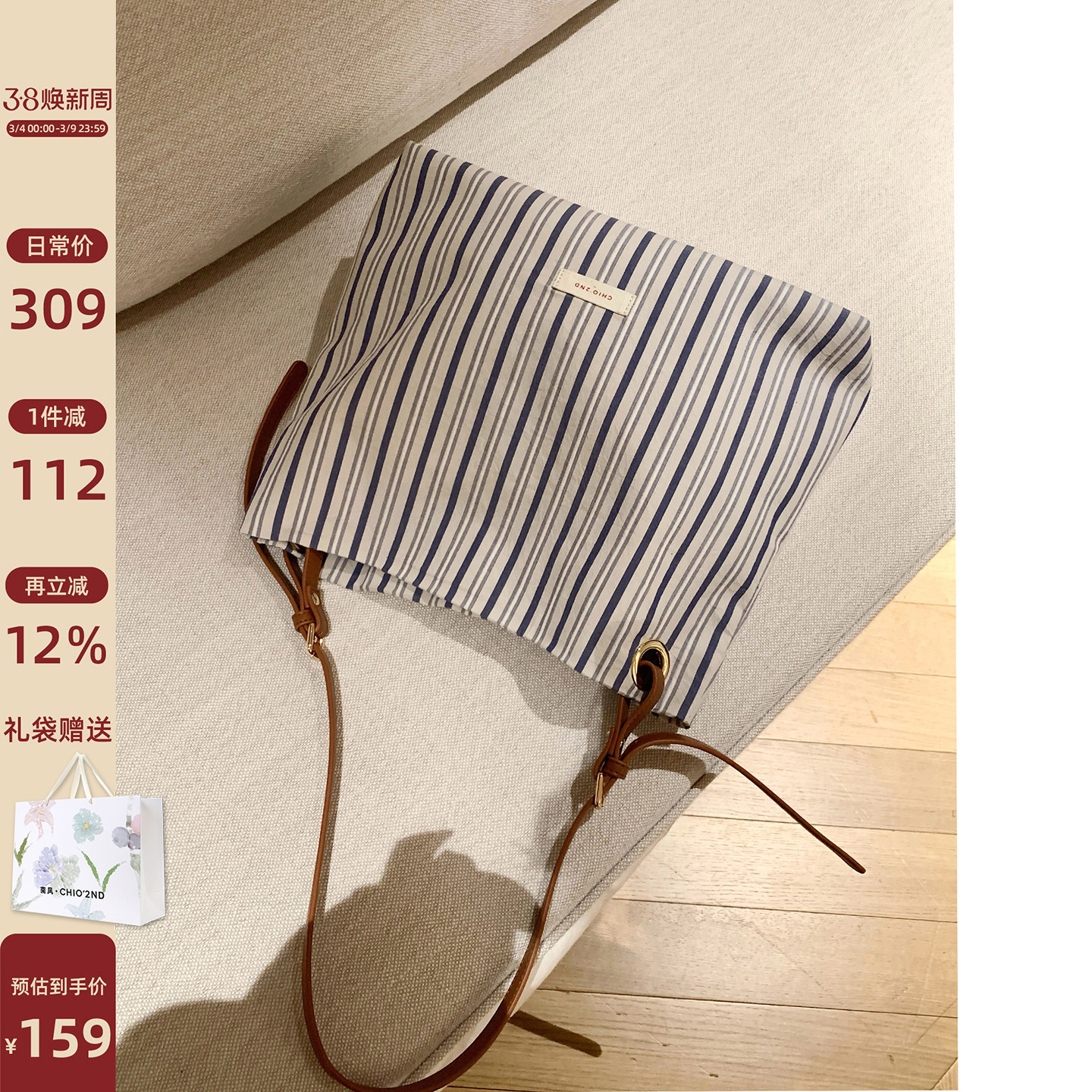 南风Chio2nd 海浪回声托特包包女蓝白条纹帆布包大容量手提单肩包