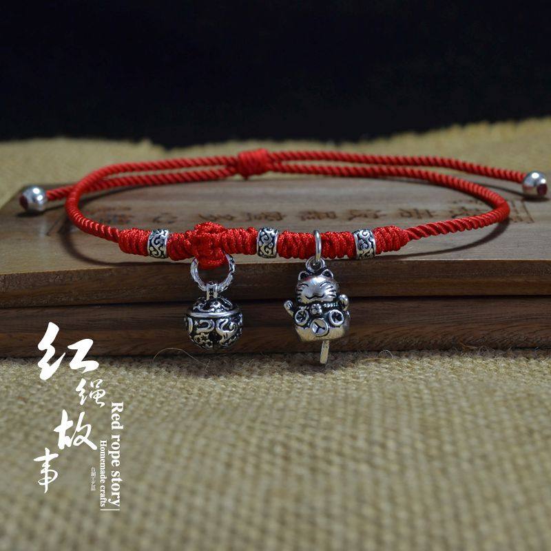 999足银小铃铛儿童纯银手链女转运珠本命年红绳编织手绳礼物脚链