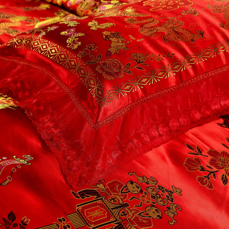 婚庆丝绸四件套全棉被里结婚织锦缎龙凤百子大红刺绣中式床品被套