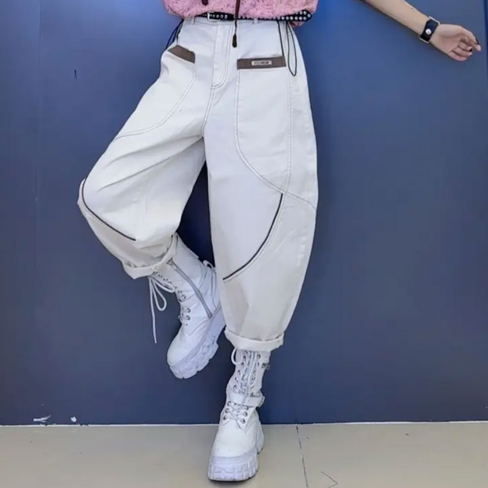 欧货大码时尚撞色哈伦小脚裤女2025春夏款高腰显瘦宽松牛仔九分裤