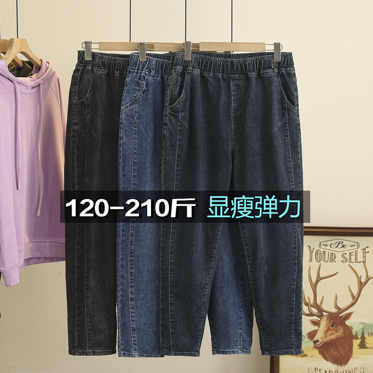 胖mm牛仔裤女大码200斤秋季松紧腰宽松显瘦萝卜九分小脚裤子