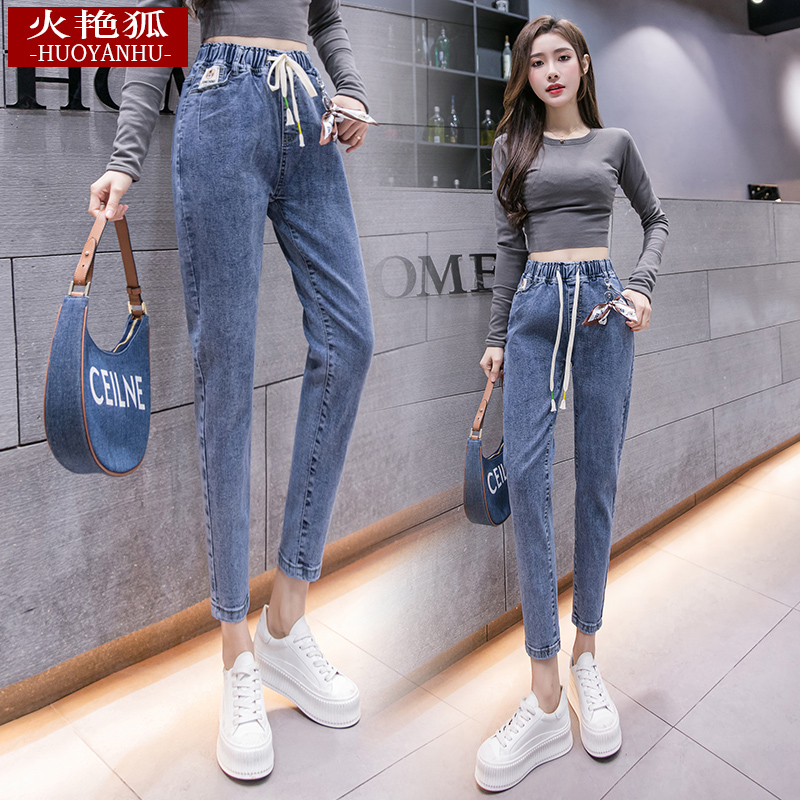 初秋薄款牛仔裤女松紧腰九分宽松高腰显瘦哈伦裤韩版刺绣小脚长裤