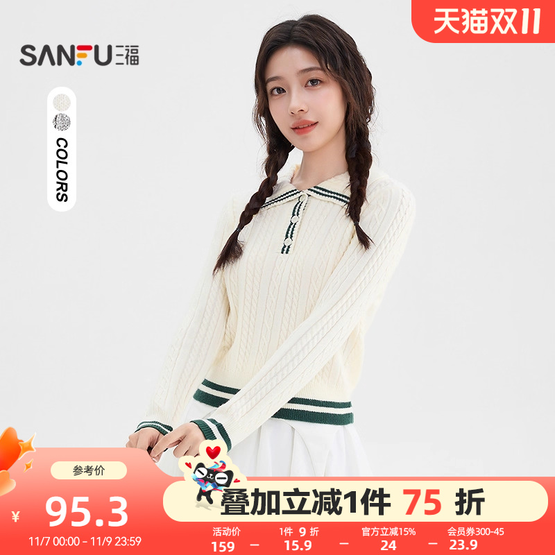 三福套头毛衣2025秋季英文刺绣针织衫撞色条纹翻领上衣女装507475