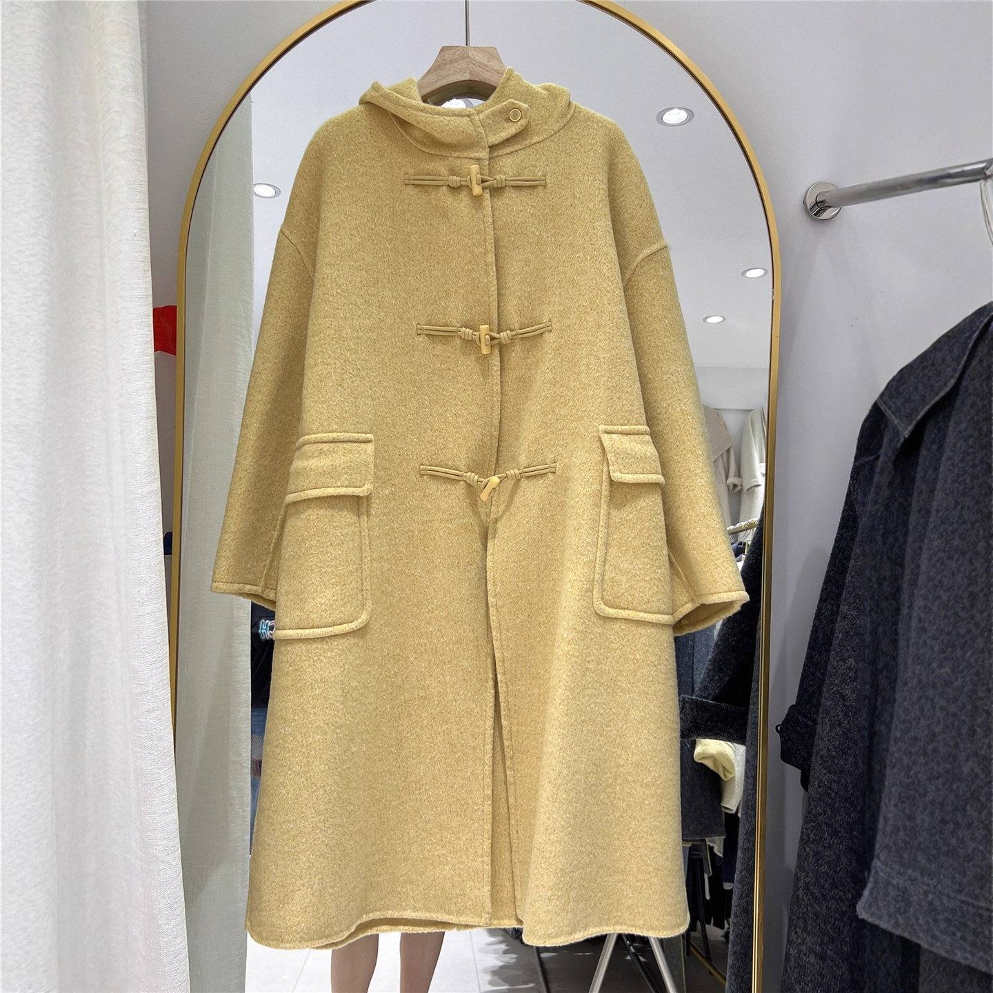2025秋冬新款双面羊绒大衣女中长款过膝连帽高端纯色羊毛呢子外套