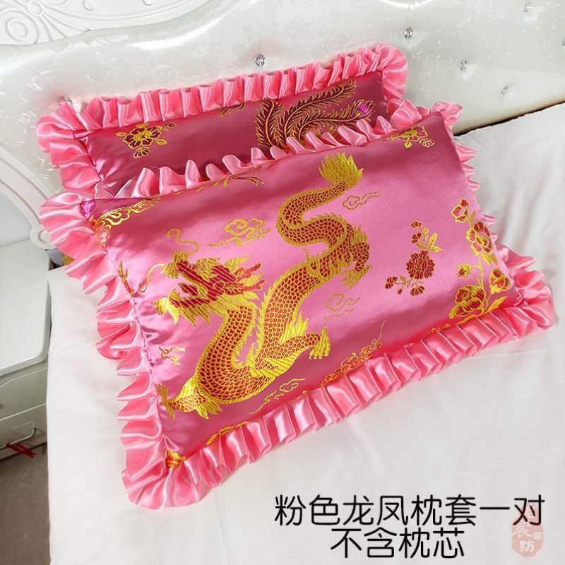 丝绸枕套结婚喜庆整套红色龙凤中国风老式绸缎边枕头套枕芯套蕾丝