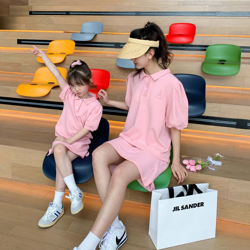 韩版春装新款亲子装连衣裙洋气时尚纯色气质泡泡袖女童公主娃娃裙