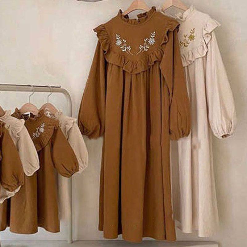 ins韩系秋装新款亲子装连衣裙 洋气荷叶边花边刺绣森系母女公主裙