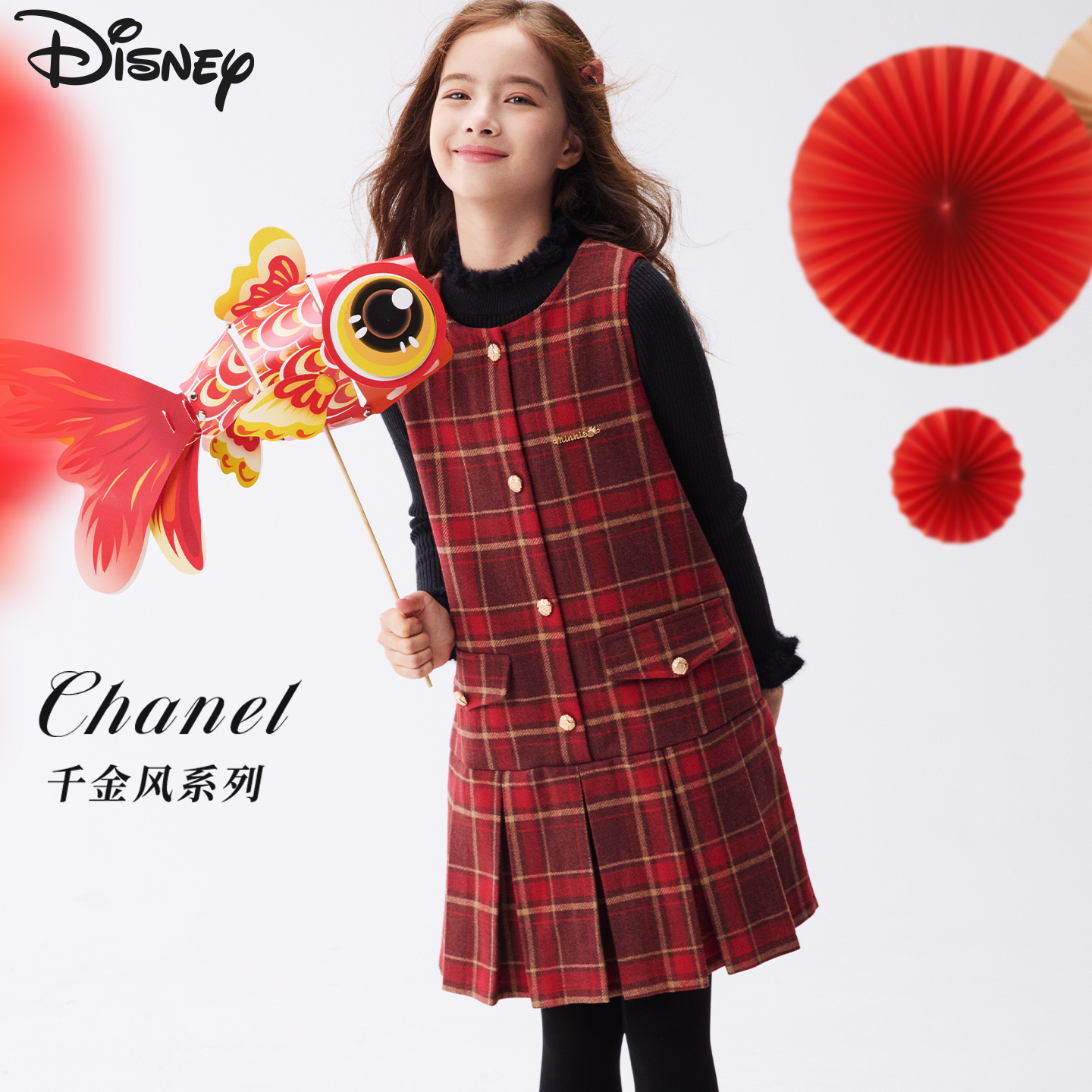 迪士尼女童红色连衣裙冬装新款儿童背心裙中大童新年装亲子拜年服