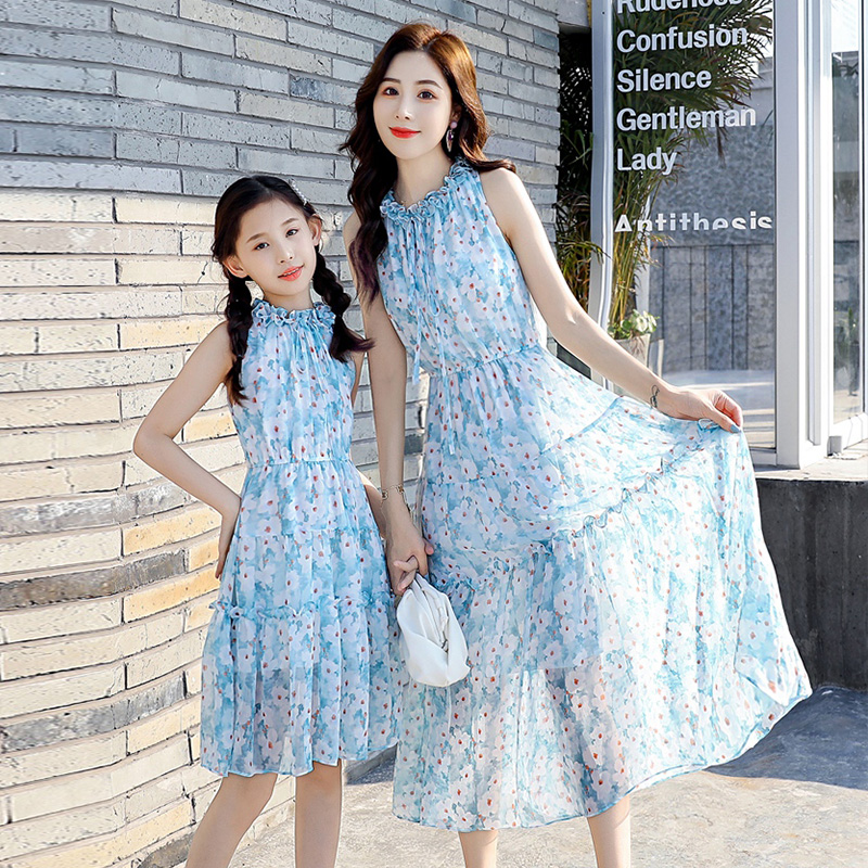 酷伽夏季优雅无袖收腰大摆印花甜美清新新款亲子装连衣裙2035