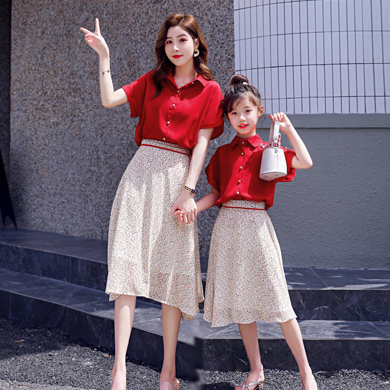 大红色网红炸街亲子装连衣裙套装2021夏装新款母女装洋气两件套潮
