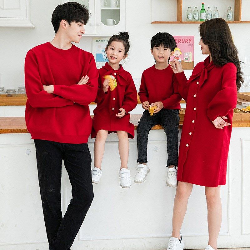 亲子装连衣裙一家三四口新年母女装秋冬针织毛衣裙圣诞红色亲子裙