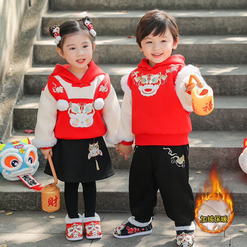 兄妹装男童冬季汉服加绒卫衣套装女童秋冬洋气拜年服套裙男女童装