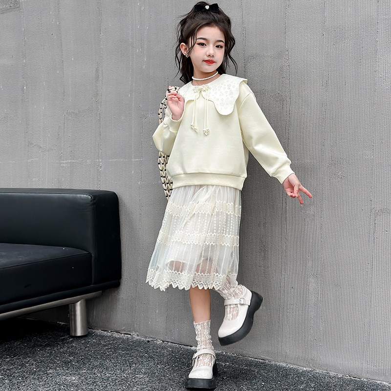 女童初春套装2024新款大童洋气国风网纱裙卫衣两件儿童学院风套裙