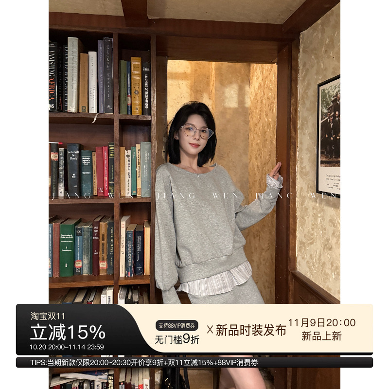 韩系灰色卫衣套装裙裤长袖露肩两件套裙子休闲上衣斜肩拼接假两件