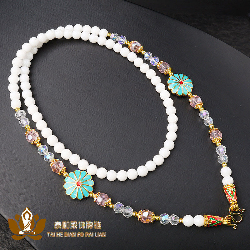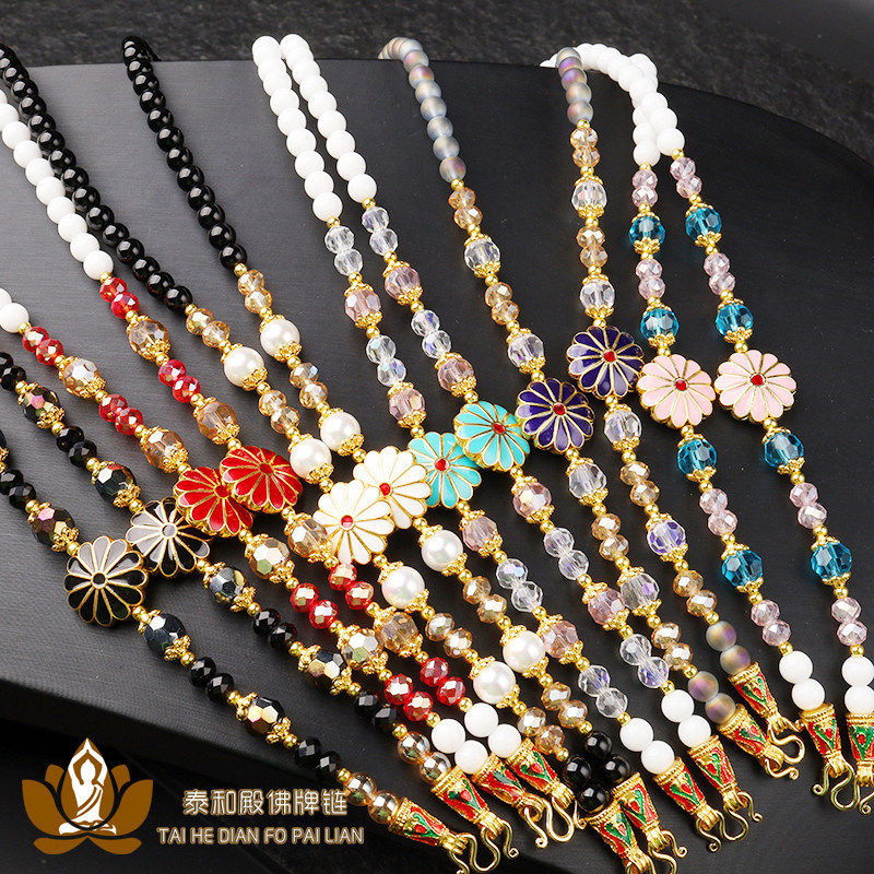 泰国佛牌链吊坠女士圆珠项链景泰蓝鎏金珐琅花蝴蝶多彩水晶圆珠链