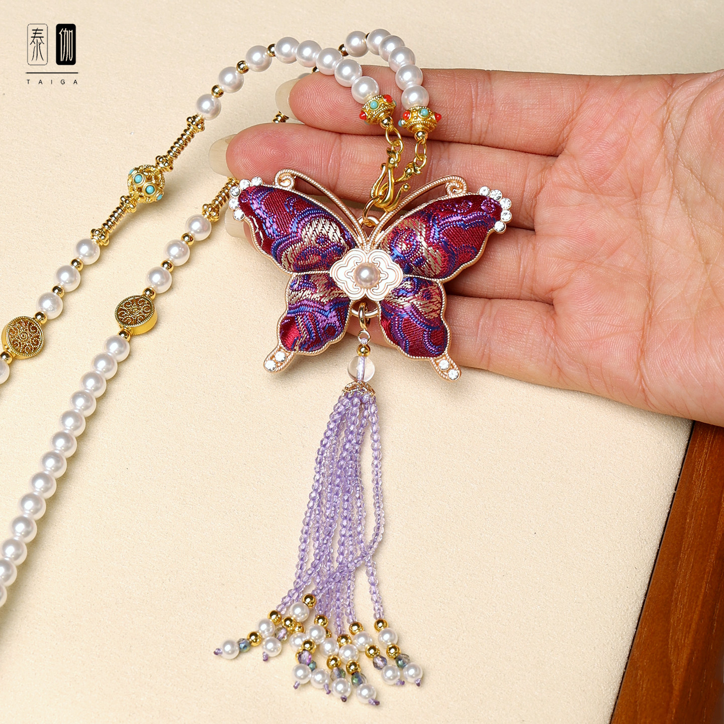 汉服毛衣链宋锦紫色蝴蝶吊坠水晶流苏珍珠项链吊坠挂链新中式国风