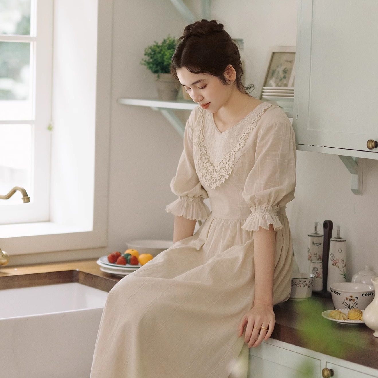 拾光裁缝 花信风 法式复古娃娃袖少女田园森系棉麻刺绣连衣裙夏