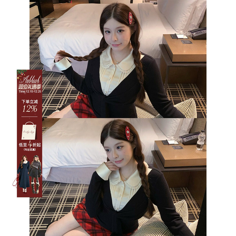 安妮不火 高智千金假两件娃娃领针织衫女微胖大码设计感长袖上衣