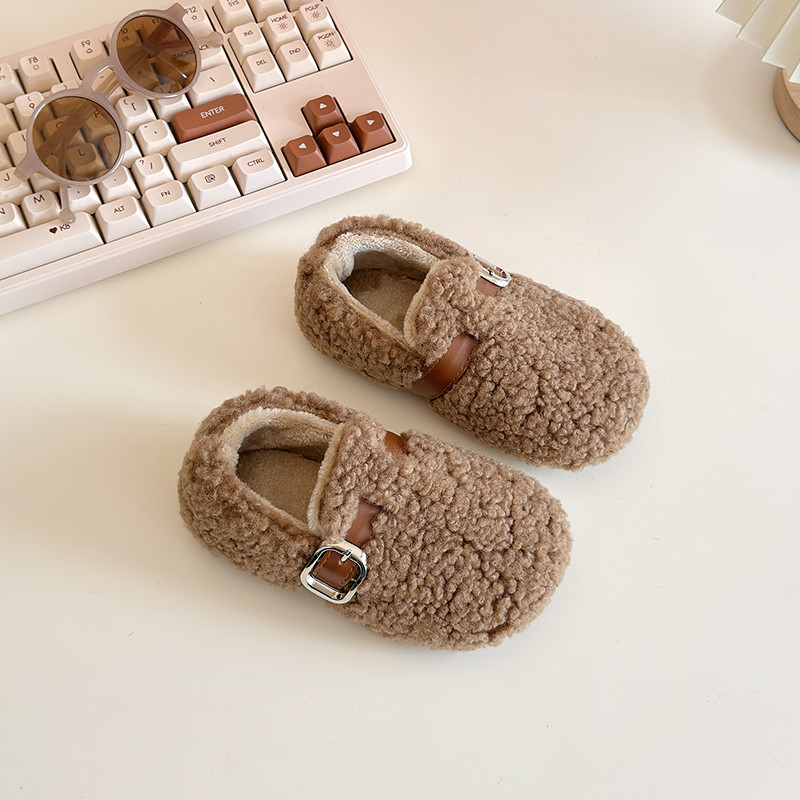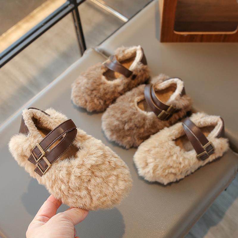 韩版2023秋冬新款宝宝鞋金属扣方头平底加绒豆豆鞋中小童毛毛鞋