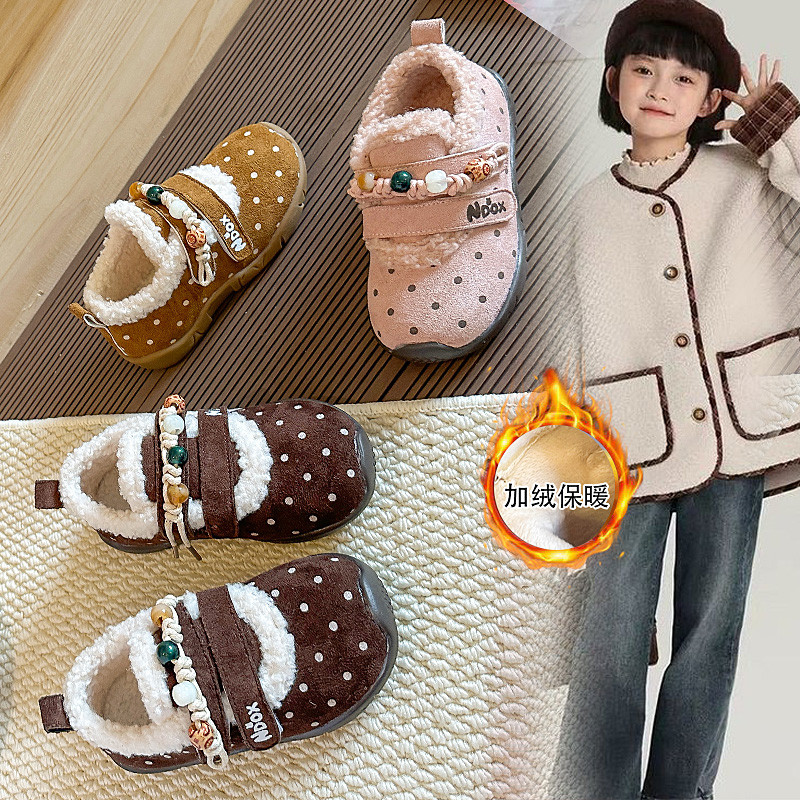 女童加绒豆豆鞋2025秋冬新款二棉波点公主鞋韩版百搭小童宝宝棉鞋