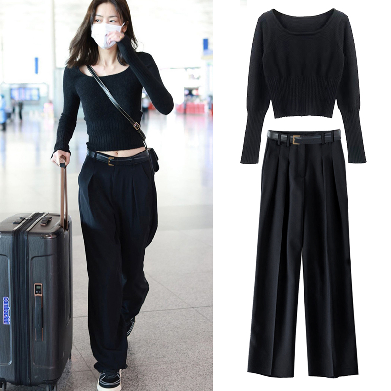 刘雯同款2023春装气质修身黑色一字领短款打底针织毛衣阔腿裤套装