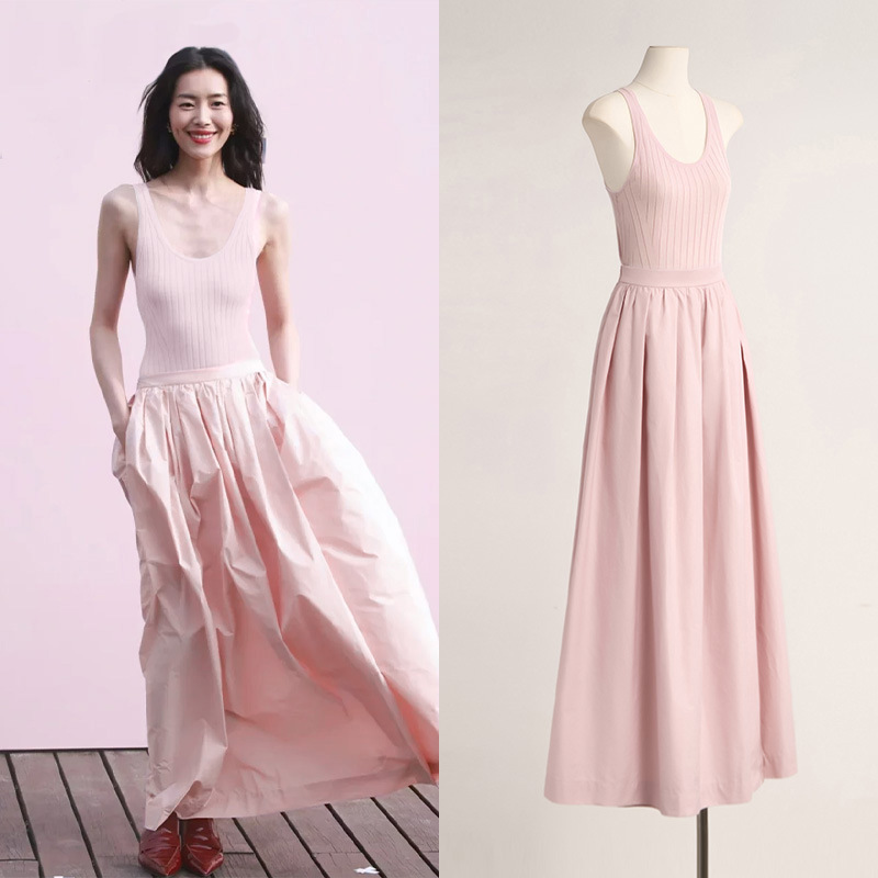 [做货中]刘雯同款U领针织背心上衣+中长款半身裙时尚龄粉色套装