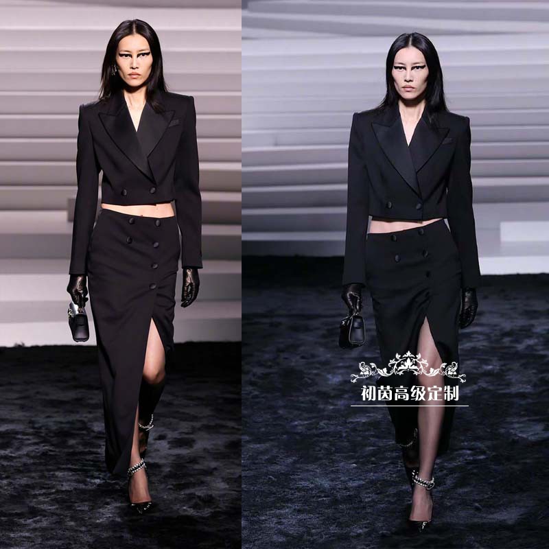 高级定制刘雯走秀同款黑色西装外套+长开叉半裙西服套装时尚大气
