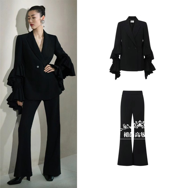 高端定制刘雯同款经典荷叶袖修身西装套装直筒裤气质大牌时髦个性