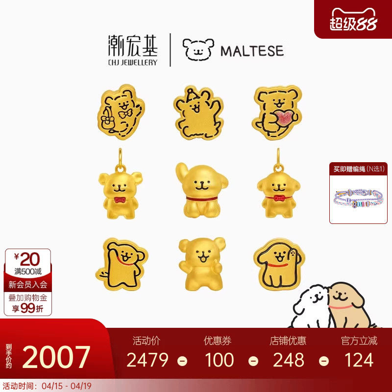 潮宏基线条小狗足金吊坠黄金硬金转运串珠磁吸好朋狗新年生日礼物
