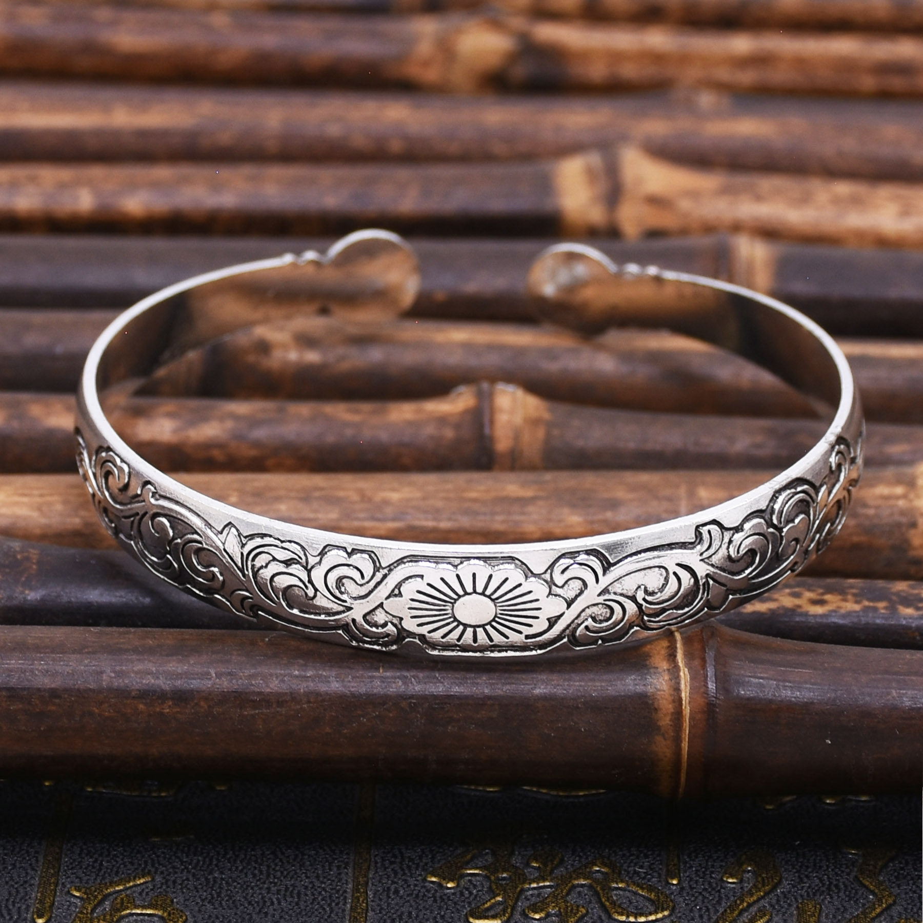 民族风复古银色雕花手镯开口式饰品藏族云南傣族盛装摄影苗族手饰