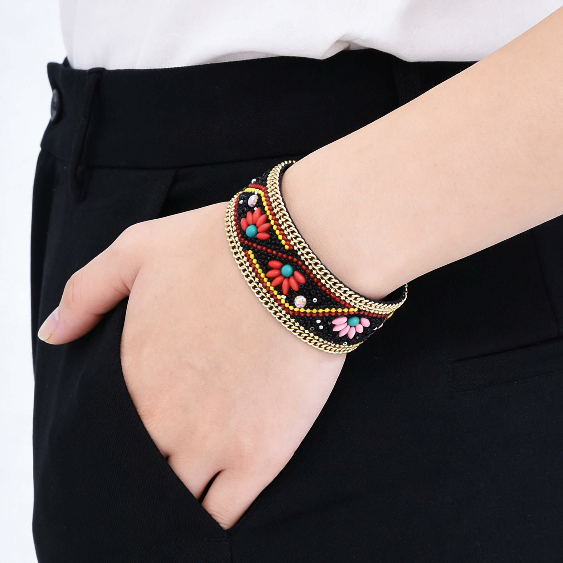 新款复古民族风编织手链女金属链条花朵装饰重工手环个性饰品手镯
