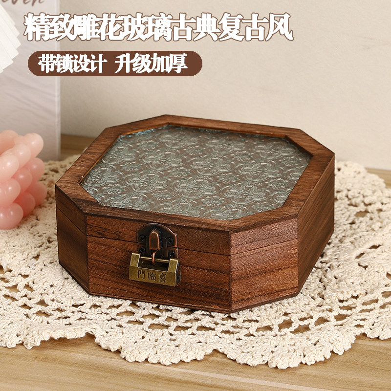 海棠花玻璃复古首饰盒精致桌面手镯饰品收纳盒储物盒带密码锁木盒