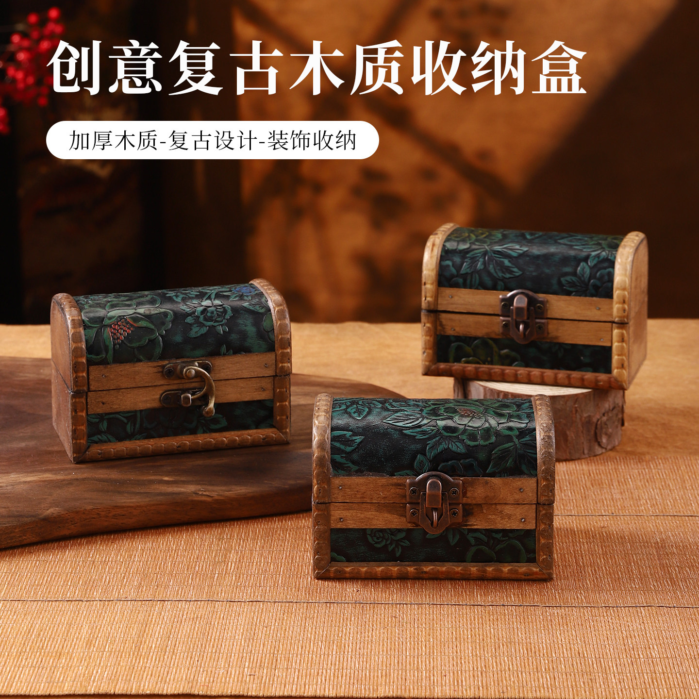 复古木质收纳盒创意雕花小木箱串珠手镯首饰盒中式古风装饰储物盒