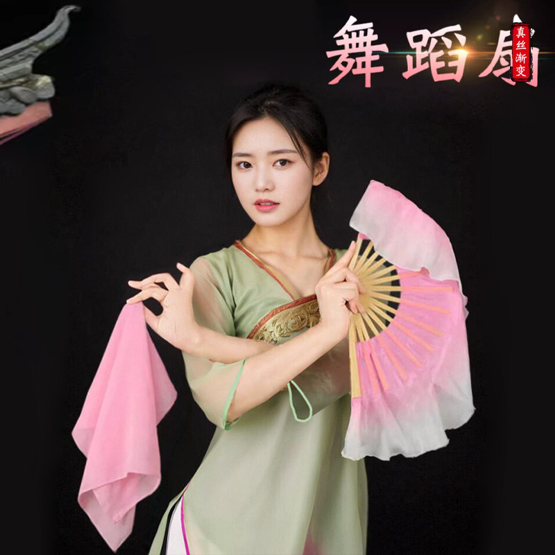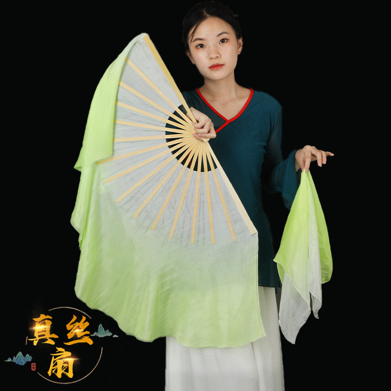 谷雨胶州扇子双面真丝舞蹈扇淡绿扇子丝巾古典舞扇成人儿童舞蹈扇