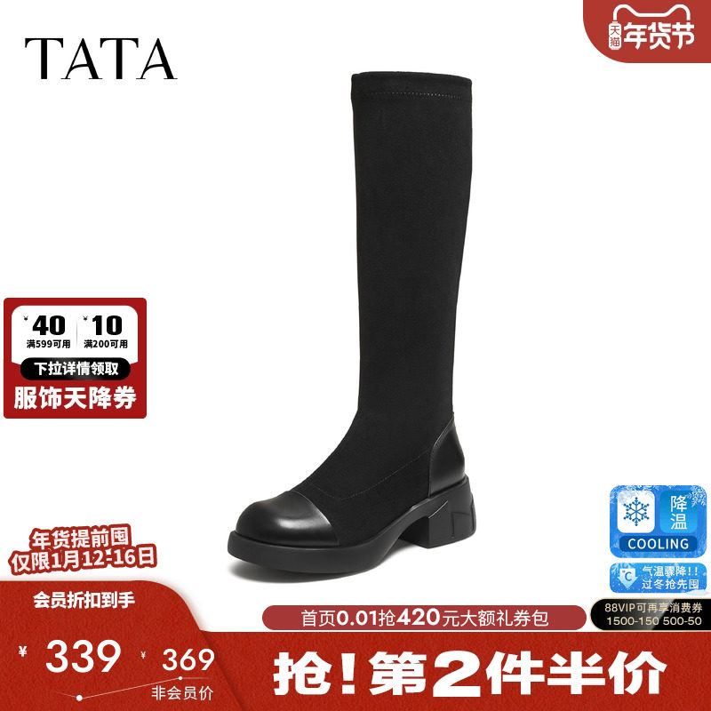 TATA他她弹力长靴女靴子长筒靴厚底粗跟黑色瘦瘦靴高筒靴CE601DG5