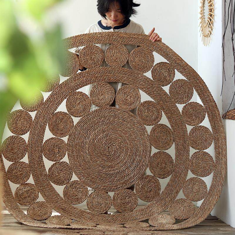 手工蒲草编织圆形地垫北欧环保民宿客厅茶几垫民族风镂空图案地毯