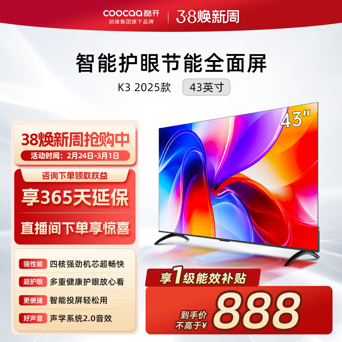 创维酷开新品K3 43英寸高清家用电视机液晶屏幕彩电官方旗舰店40