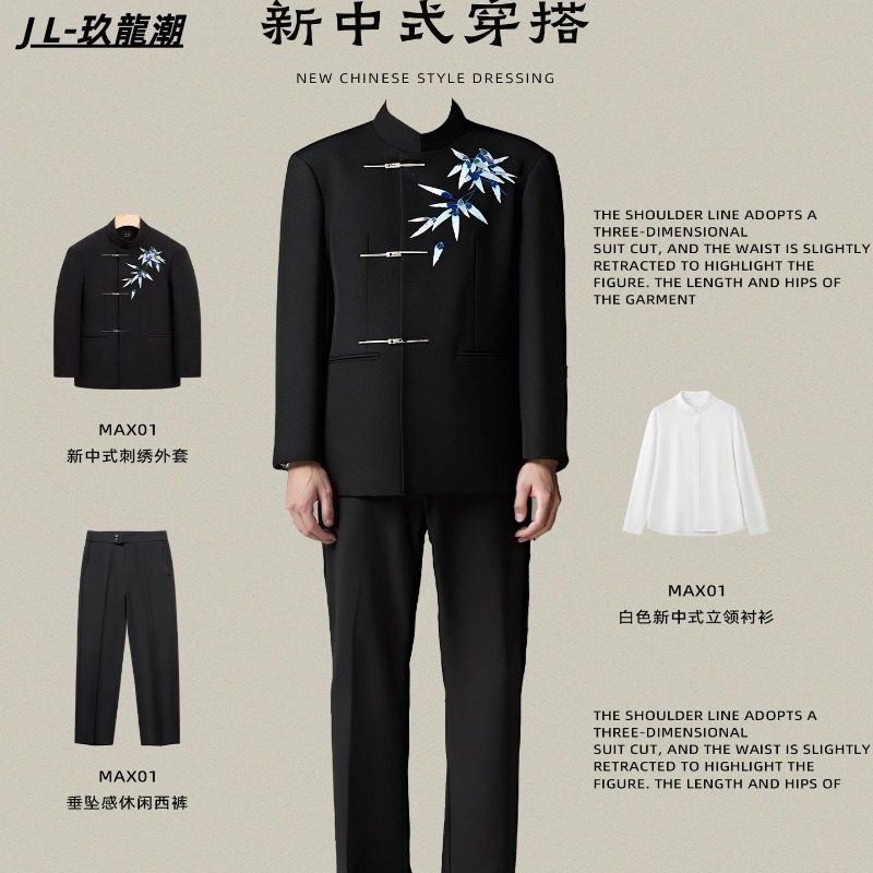 新中式国风男装中国风宽松翠竹垫肩西装外套男中山装套装上衣立领