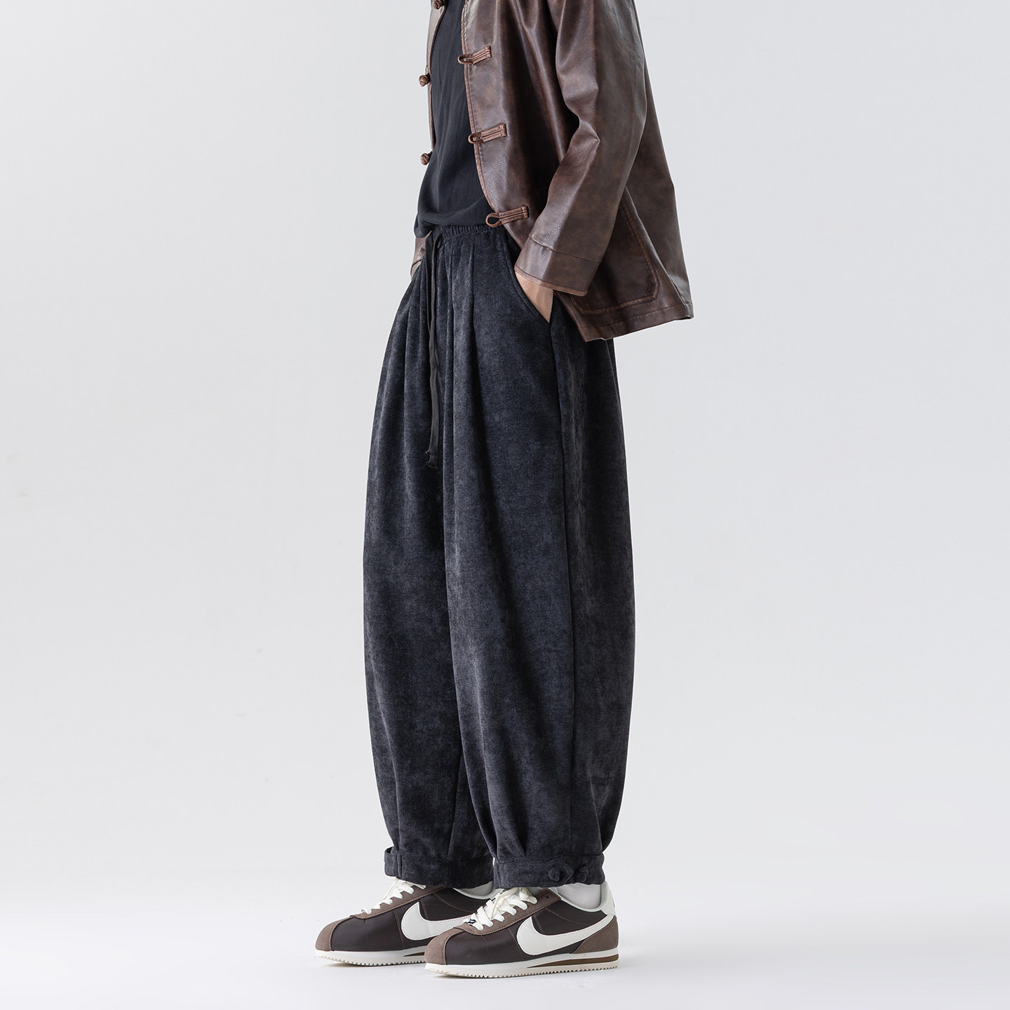 新中式国风复古盘扣束脚裤中国风男装秋冬宽松纯色百搭休闲长裤潮