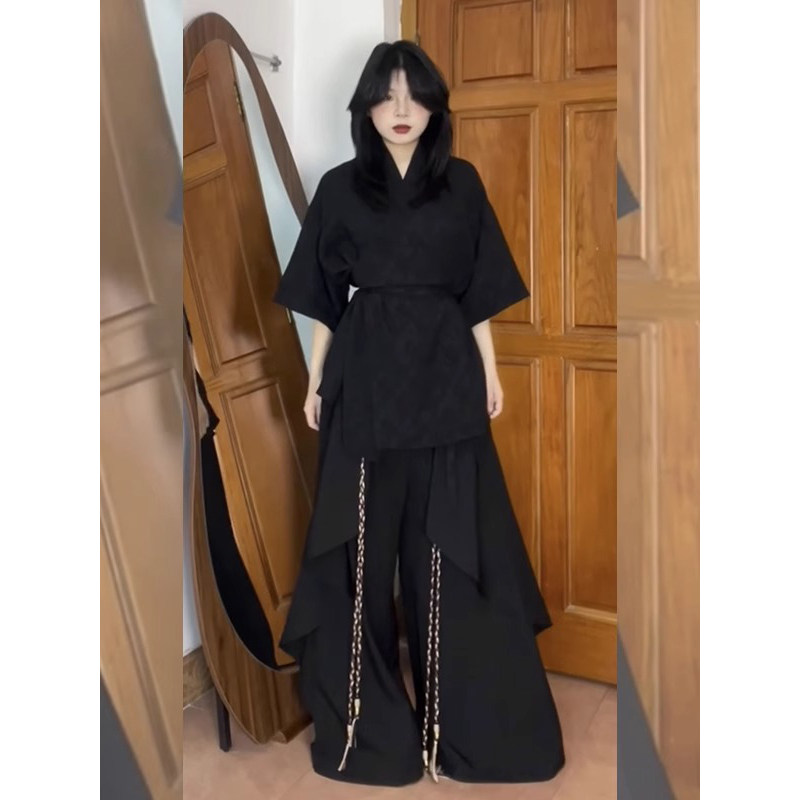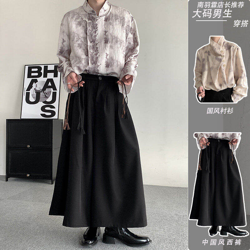 新中式山本风暗黑裙裤套装直筒阔腿垂坠感西裤高级感国风男装裤子
