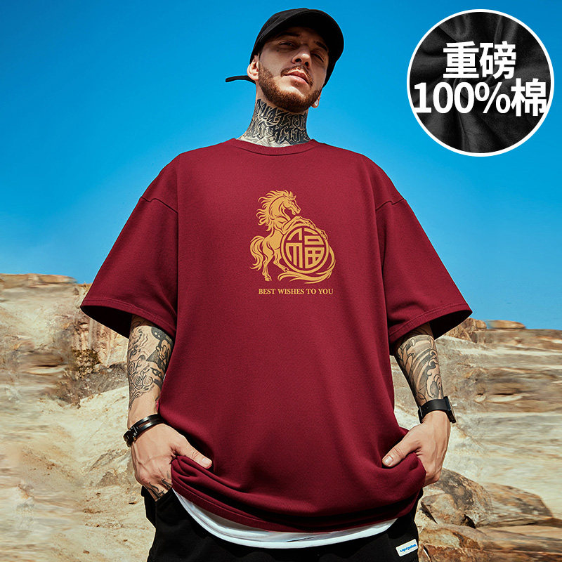 2026年马年贺岁红色T恤男士本命年300g重磅纯棉国风男装新年上衣