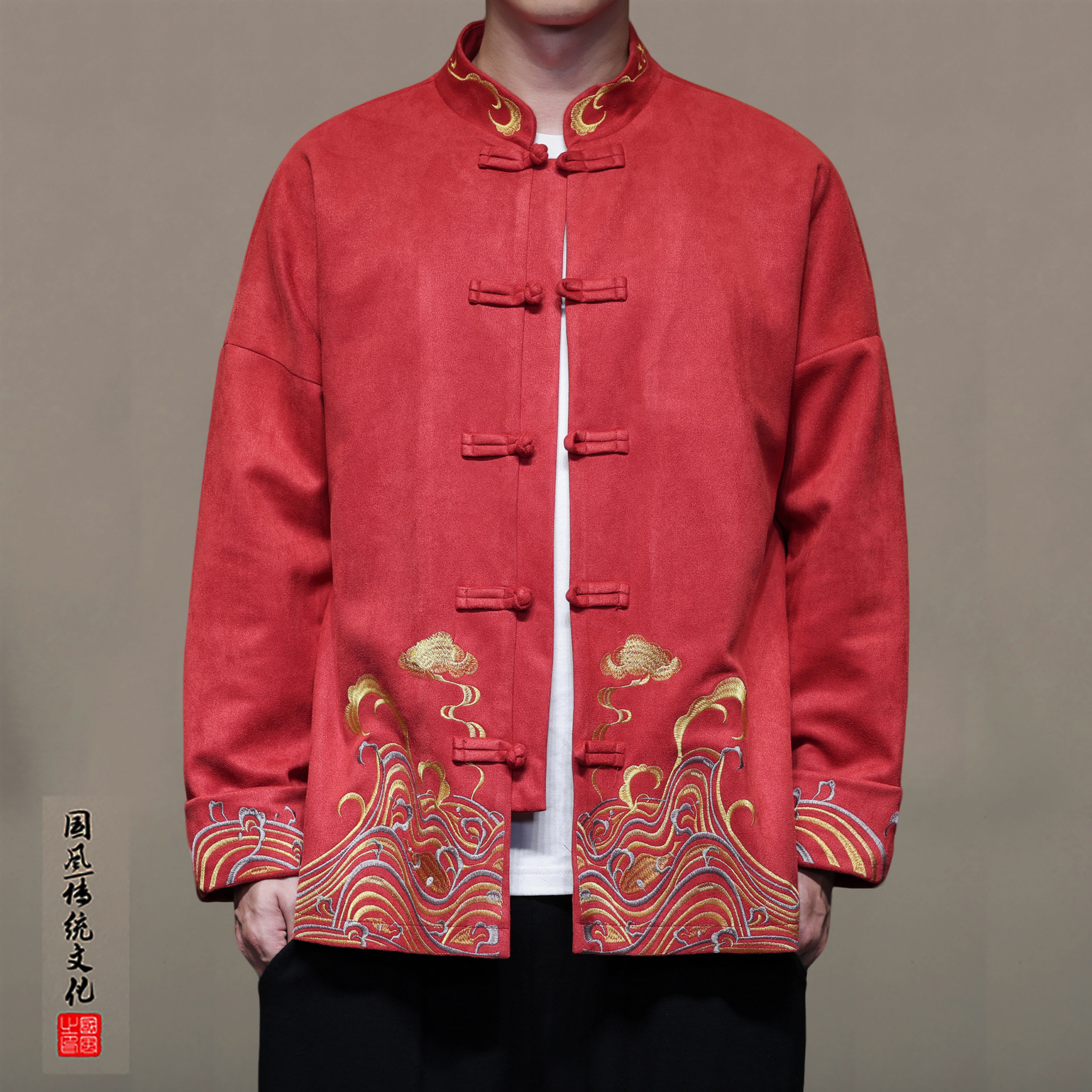 新中式国风男装外套本命年大红色刺绣唐装男款汉服夹克演出舞台服